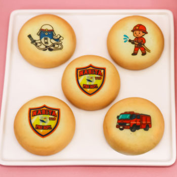 白あん(こしあん)を包み、生地の天面には「消防」と「成田」にまつわる4種類のデザインをプリントした焼きまんじゅうです。(總本店、門前店、JR成田駅前店、飯田町店、そよら成田ニュータウン店、イオンスタイル成田店限定販売)